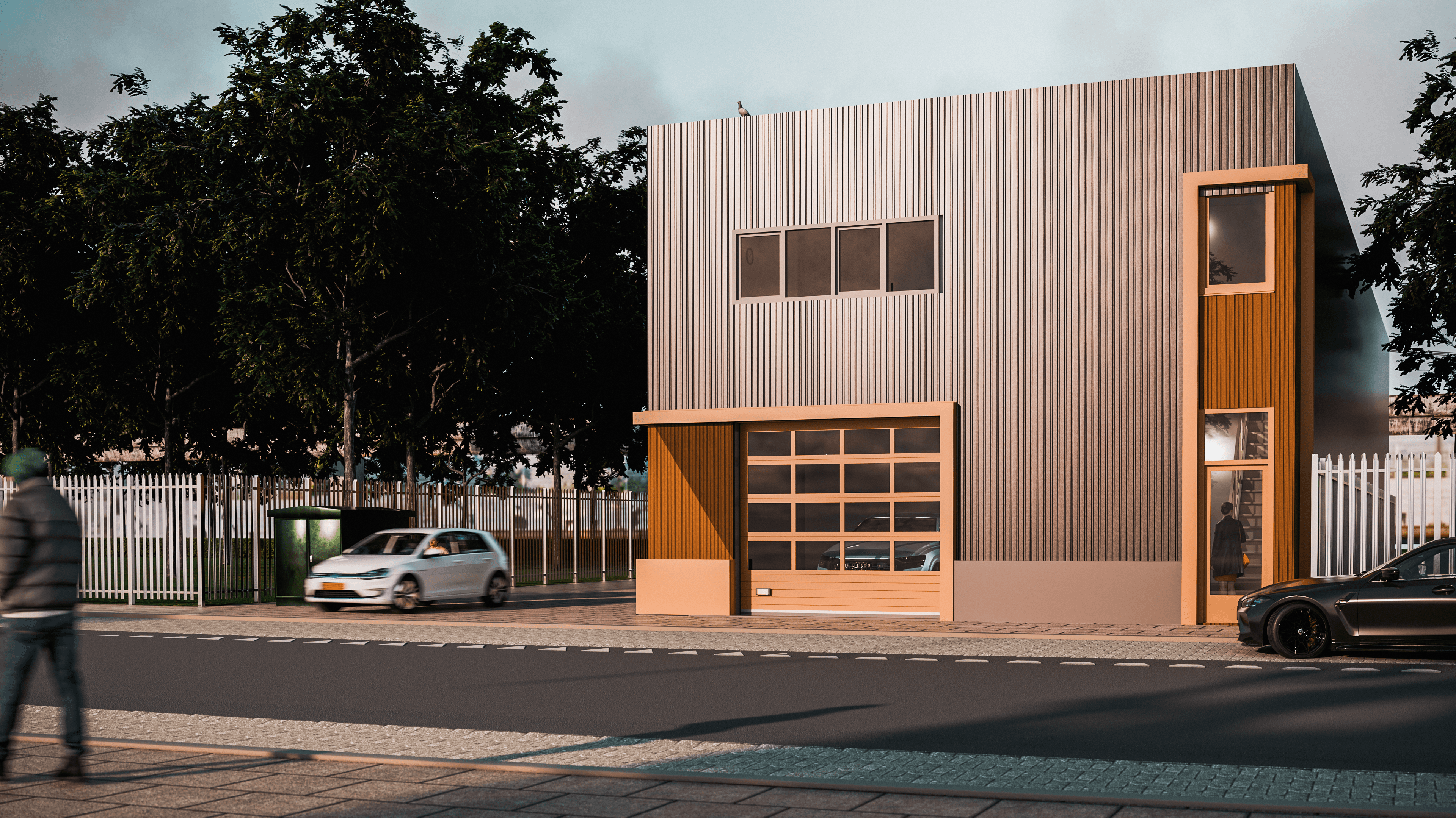 The concept focused on creating a multi-purpose structure that could serve small enterprises, startups, or tradespeople needing both work and storage space. The use of metal panels not only supports the industrial aesthetic but also keeps the construction cost-effective and durable. The orange highlights act as wayfinding elements and visual breaks, giving the building character without compromising its professional look.