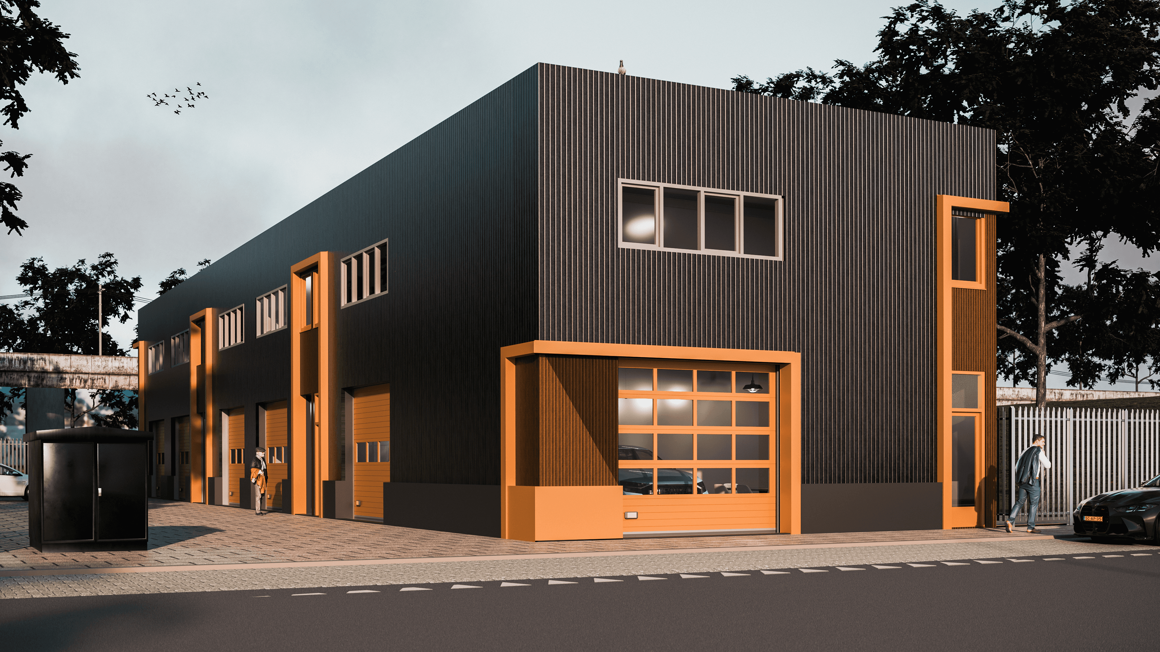 This project features a compact yet modern commercial development combining functional garage boxes with flexible office units. The building is clad in clean, industrial-style metal sheeting, with a striking black and orange color scheme that gives it a bold, contemporary identity. The form is simple and efficient, emphasizing utility while maintaining a strong visual presence suitable for a small-scale business park or light industrial zone.